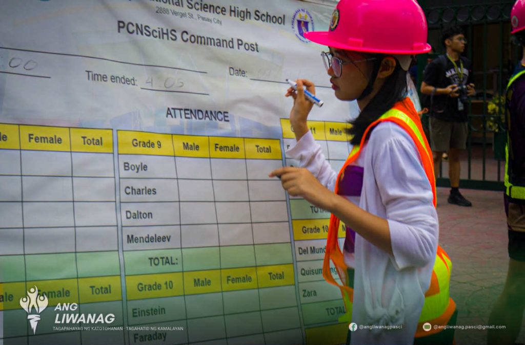 Sa pakikipagtulungan nina Chairman Alejandro Acabado III at iba pang barangay officials ng Brgy. 98, matagumpay na nakalikas ang lahat ng mga kinatawan at mag-aaral ng PCNSciHS sa loob ng tatlong minuto at 25 segundo.