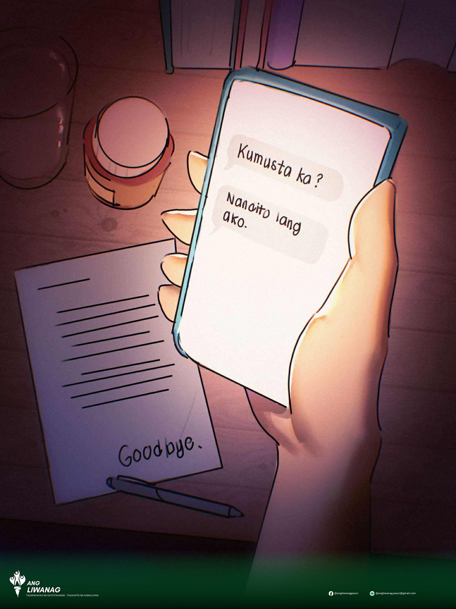 | Claire Domenden| Andrea Urbina Sa katahimikan ng gabi, mayroong isang tao na isinusulat ang isang mensahe na sana’y magiging huling alaala ng kaniyang munting buhay. Sa ilang buwang pakikipaglaban sa depresyon, naniwala siyang wala nang saysay ang bukas. Ngunit sa mismong sandaling iyon, isang mensahe mula sa kaibigan ang dumating na tila ba’y isang anghel na pumipigil upang mangyari ang isang trahedya. “Kumusta ka? Nandito lang ako.” Iilang salita lamang ngunit naging rason ito upang muling kumislap ang pag-asa na matagal nang nawala. Bunsod nito ang unti-unti niyang pagkatanto na hindi siya nag-iisa, na mayroong mga taong handang makinig at umalalay. Kalauna’y natutuhan niyang huminga muli, magpatingin, at tanggapin na ang kasalukuyang nararanasan ay hindi kahinaan bagkus ito’y bahagi ng isang laban na maaari niyang mapagtagumpayan. Sa paggunita ng National Suicide Prevention Month, dala niya ang aral na mahalaga ang mental health gaya ng ibang bahagi ng ating katawan. Higit sa lahat ay naramdaman niyang mayroong mga kamay na laging handang umalalay, at mga balikat na maaaring sandalan mula sa mga kaibigan at pamilya hanggang sa mga propesyonal. Kaya ngayon at sa mga susunod na bukas ay maalala sana natin na hindi masamang huminga at magpahinga.