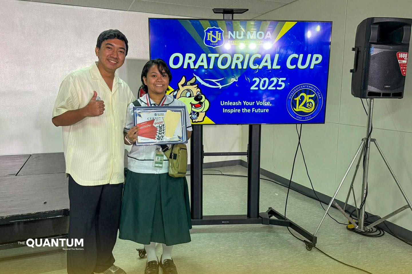 via Danella De Vera | The Quantum Martha Ysabella Clave takes First Runner-up in the 1st Oratorical Cup 2025, hosted by the National University-Mall of Asia (NU-MOA) Campus today, November 28. Her speech, ‘I am a Filipino’ by Carlos Romulo highlighted the continuous fight for independence in the modern world, and culminated a pledge to uphold freedom for future generations. Accompanied by her coach, Mr. Mark Reniel Balolo, Clave received a medal, certificate, 3,000 pesos worth of SM gift certificates, and gift cards from Motivo GCS and Orahex.