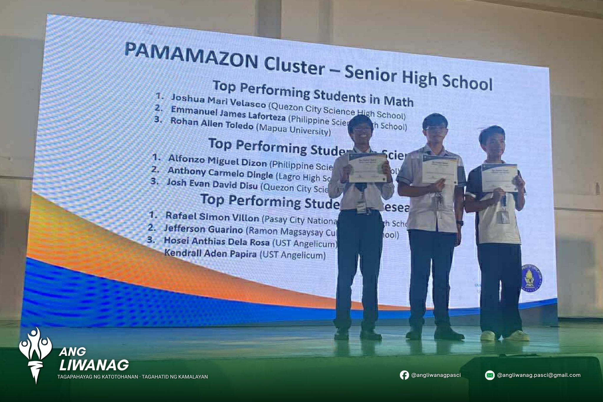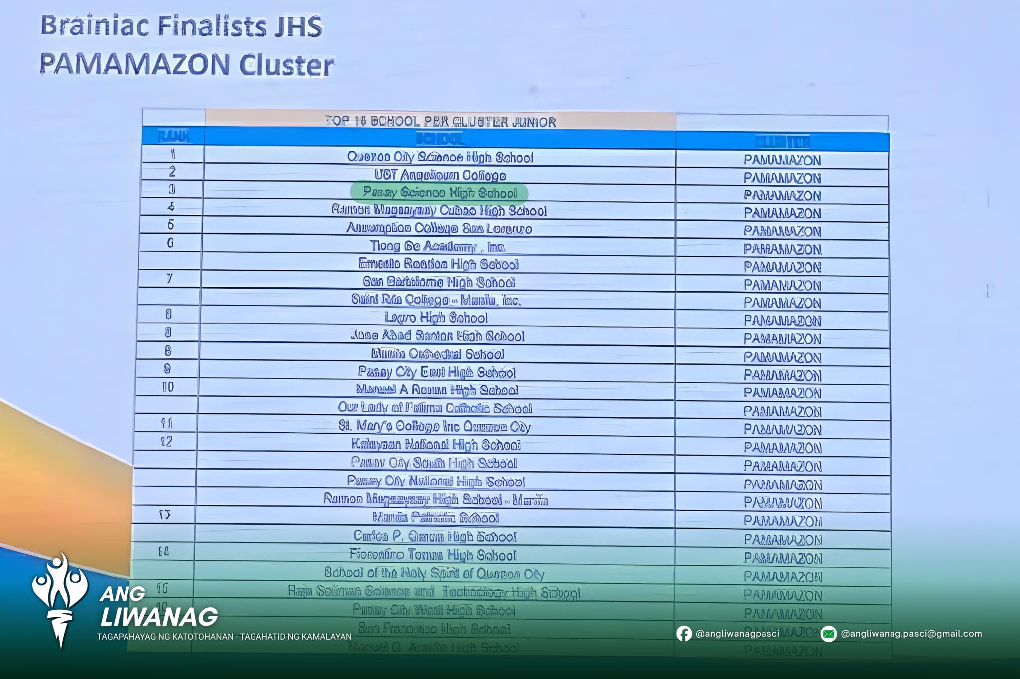 Isinulat ng Ang Liwanag TINGNAN: Nakamit ng Pasay City National Science High School ang Ikatlong Puwesto sa Junior High School – Brainiac Finalists ng PAMAMAZON Quiz Bowl Cluster sa pagsasanay ni Gng. Demetria Lappay na ginanap ngayong ika-22 ng Nobyembre sa Mandaluyong City College. Ang Grand Finals ay gaganapin sa darating na Enero 24, 2026.