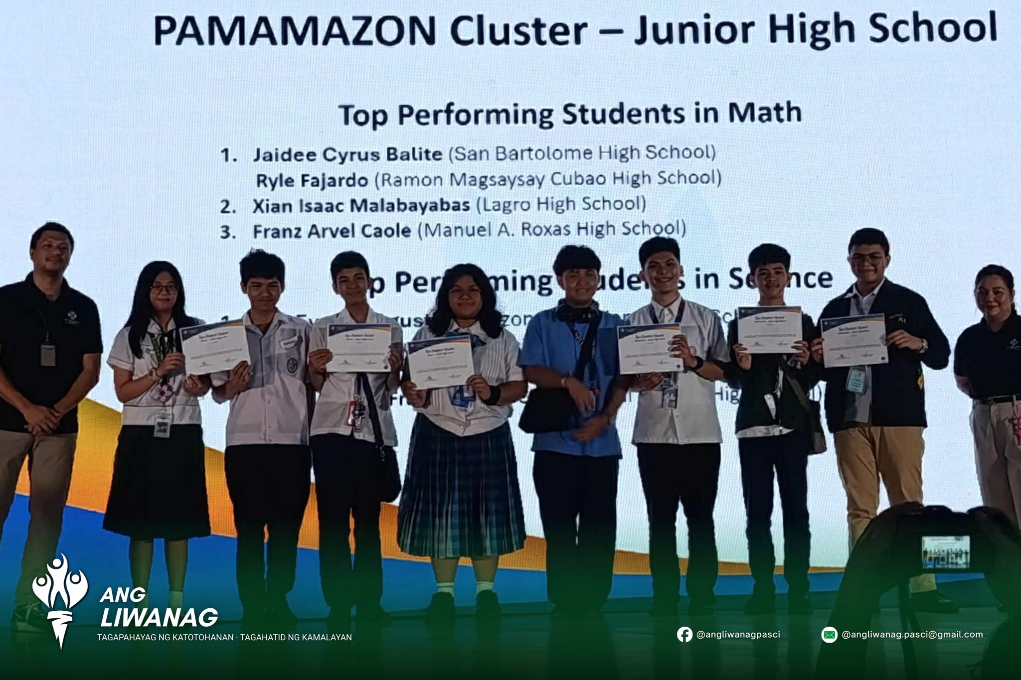 Isinulat ng Ang Liwanag TINGNAN: Nakamit ni Rhian Jennica Franco ang Ikaapat na Puwesto sa pangkahalatang asignatura sa PAMAMAZON Quiz Bowl Cluster Qualifying Round – Junior High School Category sa pagsasanay ni Gng. Demetria Lappy, na ginanap sa Mandaluyong City College, ngayong ika-22 ng Nobyembre.