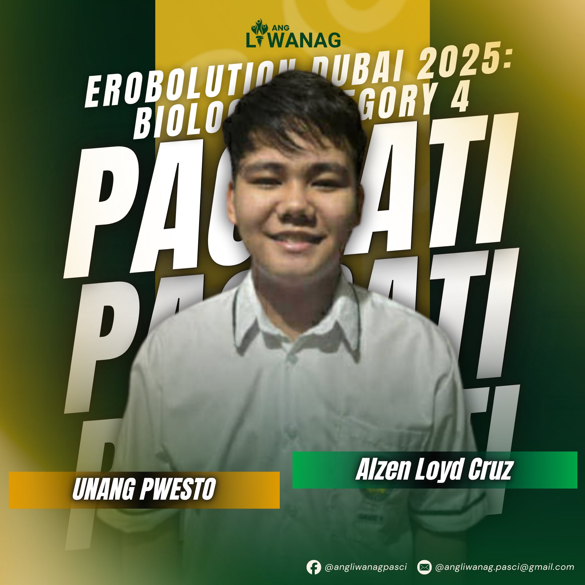 | Zacharie Macalalad| Czyrish Conanan Nagwagi ang PaScians sa eROBOLUTION Dubai 2025: Global Olympiad in RAMPS (Robotics, AI, Math, Programming & Science) – Preliminary Rounds BATCH 2 na ginanap online noong Oktubre 10, 17, 25, at 26. Nasungkit ni Alzen Loyd B. Cruz ang unang pwesto sa Biology (Category 4), at ikalawang pwesto sa Chemistry (Category 4). Habang parehong nakamit ni Christian Dave Tabada ang ikalawang pwesto sa Chemistry and Biology (Category 3). Nagwagi naman sina Willard James H. Alfonso ng ikalawang pwesto sa Biology (Category 4), Orange Zyrille G. Alcaraz ng ikalawang pwesto sa Mathematics (Category 4), at Einsen Weins Vicente ng ikatlong pwesto sa Robosim (Junior High School Category). “Noong malaman ko po na 2nd place po ako, sobrang natuwa talaga ako kasi ramdam ko na nagbunga ‘ang mga oras na nilaan ko para dito,” ani Alcaraz. Ang mga kalahok sa ikatlong kategorya ay ang mga mag-aaral na mula sa ika-7 at ika-8 baitang, at ang mga kalahok sa ikaapat na kategorya ay mga mag-aaral mula sa ika-9 at ika-10 baitang. Layunin ng paligsahan na ito na paunlarin ang kakayahan ng mga kabataan sa larangan ng robotics, artificial intelligence, matematika, programming, at agham; at bigyang-daan ang internasyonal na kompetisyon para sa inobasyon. Ang Top 3 placers na nagkamit ay magsisilbing kinatawan ng Pilipinas sa Global Finals ng paligsahan na gaganapin sa Dubai. Nakamit ng mga mag-aaral ang tagumpay na ito sa tulong at gabay ni Gng. Aizah C. Agub-Ariz, Gurong Tagapagsanay na sinuportahan ni Gng. Lejanie T. Baya, Puno, Kagawaran ng TLE-ICT, sa ilalim ng pangangasiwa nina Gng. Sara Jane T. De Los Santos, Kawaksing Punongguro, at Dr. Mark Anthony F. Familaran, Punongguro.