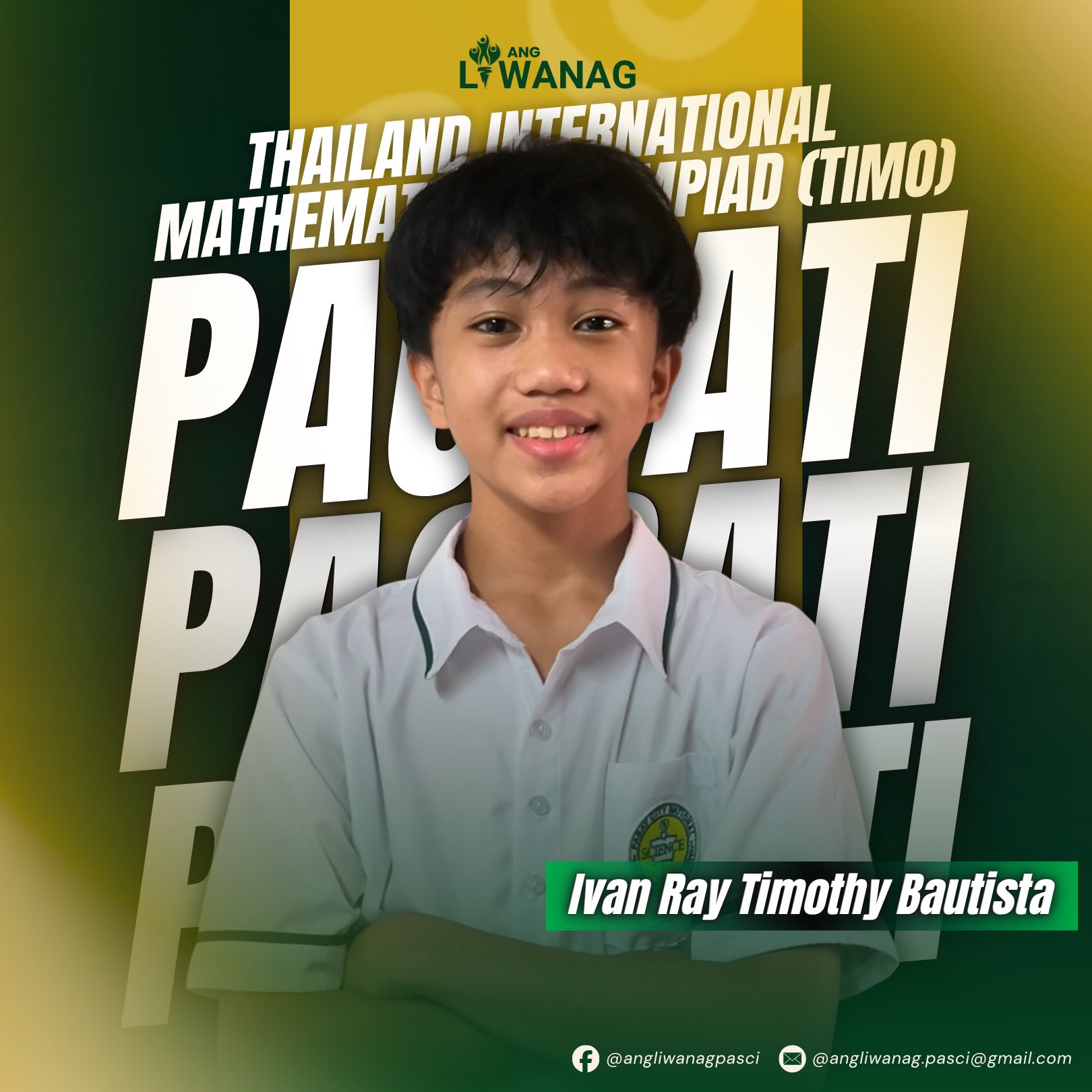 | Juan Ian Antonio Cabingue| Czyrish Conanan| Ashley Ballesteros Nakamit at nagtagumpay ang mga mag-aaral mula Pasay City National Science High School (PCNSciHS) sa ginanap na Thailand International Mathematical Olympiad (TIMO) – Heat Round nitong ika-19 ng Oktubre gamit ang online na plataporma. Inilabas ang opisyal na resulta noong Oktubre 23, 2025 sa pamamagitan ng Facebook post at Google Drive link na binubuo ng mga libo-libong estudyanteng Pilipino mula Kindergarten hanggang Senior Highschool. Kabilang dito ang mga mag-aaral ng PCNSciHS, na nagwagi sa patimpalak. Nasungkit ni Ivan Ray Timothy Bautista ang gintong medalya sa Grade 7 category. Samantala sa Grade 9 category, nakamit ni Orange Zyrille Alcaraz ang gintong medalya at ni Tristan Johann Bautista ang medalyang pilak. Sa larangan naman ng Senior High School category, natamo ni Filha Ray Penelope Bautista ng ika-12 baitang ang gintong medalya. Nagpakita sila ng isang lohikal na pag-iisip, malikhaing pag-iisip sa problem solving, at interes sa larangan ng Sipnayan. Ang kanilang mga nagawa ay nagbigay inspirasyon sa kanilang mga kapwa mag-aaral at ipinakita rin dito ang potensyal na pag-abot nila sa pamantayan ng Thailand at ang kanilang kahusayan sa asignaturang Matematika. Ang Thailand International Mathematical Olympiad (TIMO) ay kinikilala bilang isang pandaigdigang paligsahan na may layuning paunlarin ang malikhaing pag-iisip, palakasin ang kanilang kasanayan sa kompyutasyon, at mas lalong payabungin ang interes ng bawat mag-aaral sa larangan ng Sipnayan. Naipakita ng mga estudyanteng Pilipino ang kanilang kahusayan sa Matematika sa internasyunal na level sa tulong ng virtual na plataporma. Nagtagumpay ang mga mag-aaral ng PCNSciHS sa kompetisyong ito sa gabay at tulong ng kanilang mga tagapagsanay na sina G. John Bryan P. Pacris, Gng. Chiradee O. Javiniar at Bb. Rexielle Joy V. Villareal. Inorganisa ito ng Math Olympiads Training League Inc. (MOTLI) na may motto na “Create the genius in each child ” at may layuning mas paunlarin pa ang mga talento ng mga kabataang Pinoy sa asignaturang Matematika.