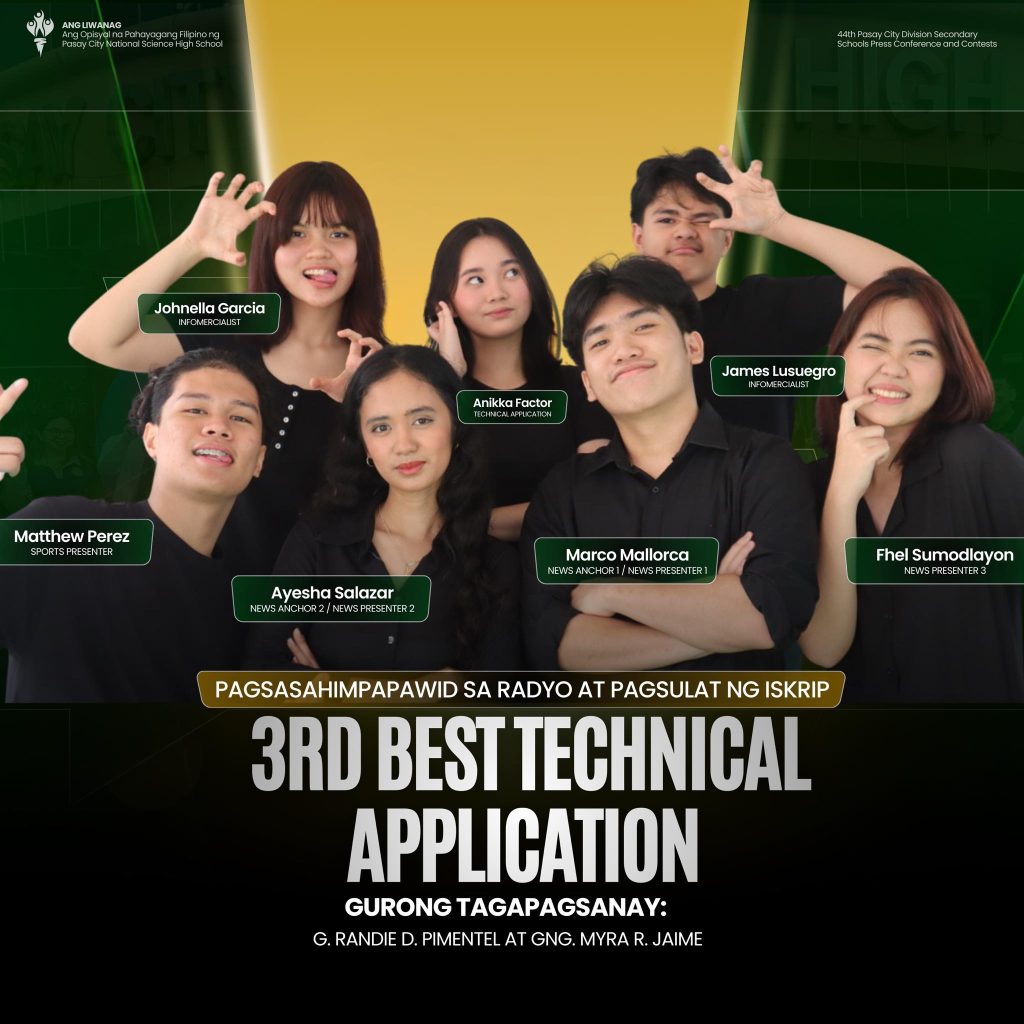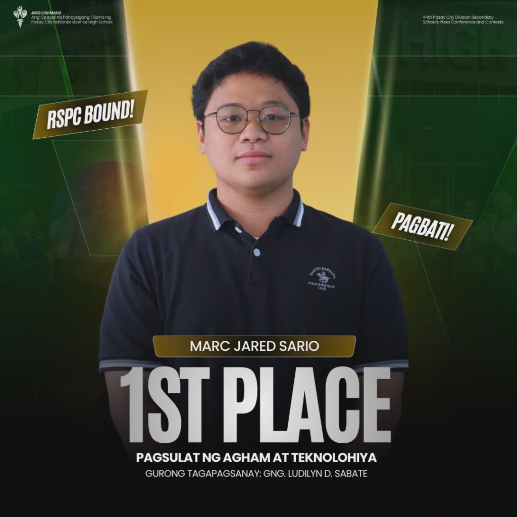 Hindi rin nagpahuli si Marc Jared Sario, na umani ng unang puwesto sa Pagsulat ng Agham at Teknolohiya sa tulong ni Gng. Ludilyn D. Sabate. Si Joebbie Krizel Gaugano naman ang nanguna sa Pagwawasto at Pag-uulo ng Balita sa paggabay ni Gng. Myra R. Jaime. Sa Pagsasahimpapawid ng Balita at Pagsulat ng Iskrip, nakamit ni Marco Mallorca ang ikalawang puwesto bilang Best Anchor sa tulong nina G. Randie Pimentel at Gng. Myra Jaime. Kasama niya sina Ayesha Salazar, Fhel Sumodlayon, Matthew Perez, Anikka Factor, James Lusuegro, at Johnella Garcia sa ikatlong puwesto sa Best Technical Application.